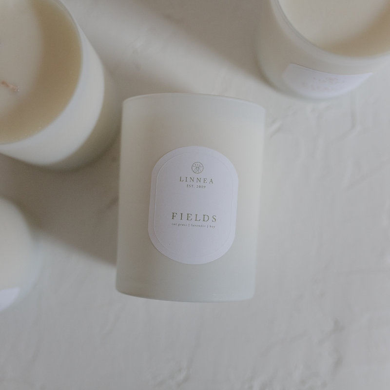 These amazing candles form Linnea are handcrafted in small batches using only the highest quality fragrances and essential oils. The Fields candle is inspired by running barefoot through an open meadow, prairies of the Heartland, golden bales of hay shimmering in the distance. Notes include cut grass, lavender and hay.